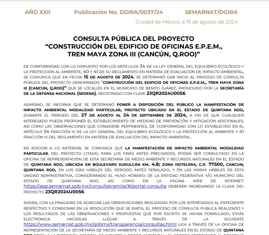 Quien quiera consultar datos específicos, la Semarnat invita para que acudan a sus oficinas ubicada en boulevard Kukulcán km. 4.8; zona hotelera de Cancún, en días hábiles. Así como en la página web: https://app.semarnat.gob.mx/consultatramite/#/portal-consulta deberán ingresando la clave del proyecto 23QR2024U0056.