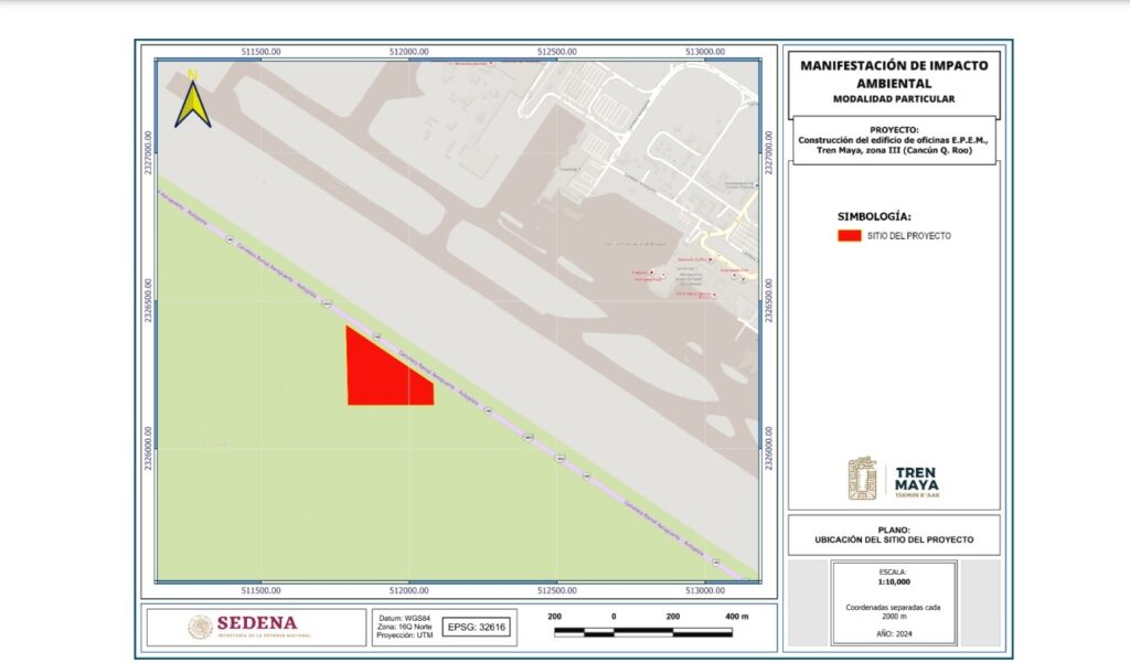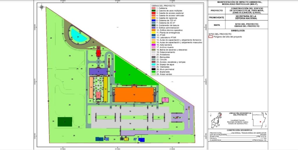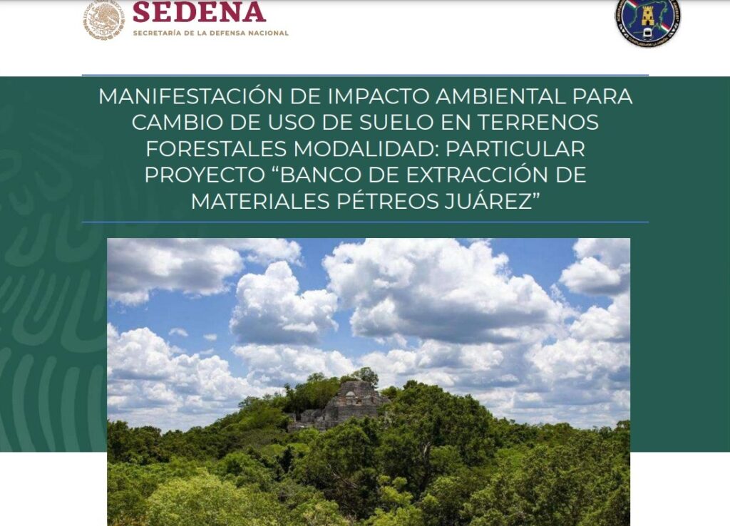 El segundo proyecto, con clave 23QR2024M0057 promovido por la Sedena, es el “Banco de Extracción de Materiales Pétreos Juárez”, que se localiza en el Municipio Benito Juárez (Cancún);