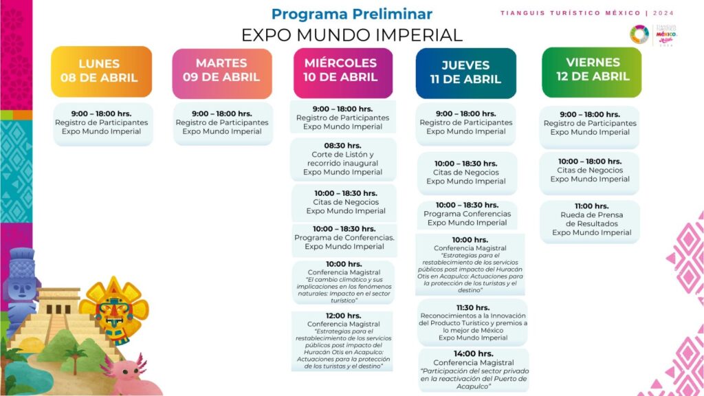 El programa preliminar detalla que el lunes 08 y martes 09 de abril de las 9:00 de la mañana a las 6:00 de la tarde será el registro de participantes en la “Expo Mundo Imperial” que será la sede del evento; para el miércoles 10, continuará el registro, pero a las 08:30 de la mañana (9:30 Quintana Roo), las autoridades realizarán el corte del listón y el recorrido inaugural, a las 10.00 inician las conferencias. Para el jueves 11, a parte de las conferencias magistrales, a las 11:30 de la mañana será el reconocimiento a la Innovación del Producto Turístico y premios a lo mejor de México; para el viernes 12, a las 11:00 de la mañana los organizadores con las autoridades darán una rueda de prensa de Resultados; concluye el evento.