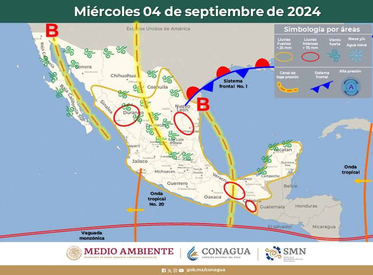 A su vez, la onda tropical No. 20 se desplazará sobre el occidente de la República Mexicana, se combinará con inestabilidad en niveles altos de la atmósfera, propiciando lluvias fuertes a muy fuertes con descargas eléctricas, rachas de viento y posibles granizadas en la mencionada región.