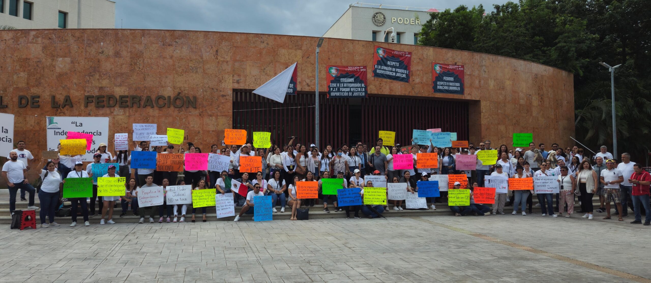 Cancún.- Aproximadamente 200 trabajadores del Poder Judicial de la Federación se manifestaron esta tarde a las afueras de la sede en Cancún, ubicada en la Supermanzana 50, en contra de la desaparición de 13 fideicomisos que tiene la plantilla laboral.
