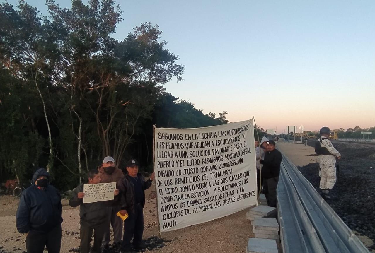 “Seguimos en lucha y pedimos a las autoridades que acudan para escucharnos y llegar a una solución favorable para el pueblo y el ejido. Pasaremos la Navidad defendiendo lo justo que nos corresponde de los beneficios del Tren Maya, ya que el ejido dona o regala las dos calles que conecta con la estación y solicitamos los apoyos de caminos saca cosechas y la ciclopista”, expresaba dicha lona.