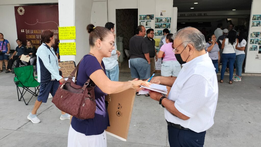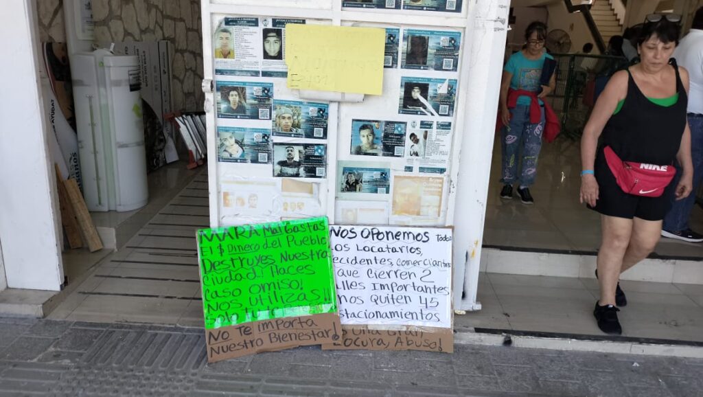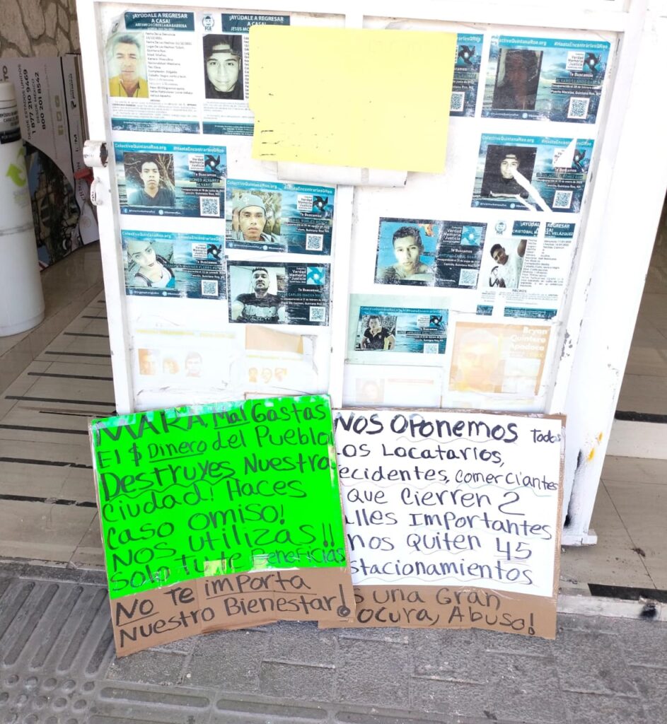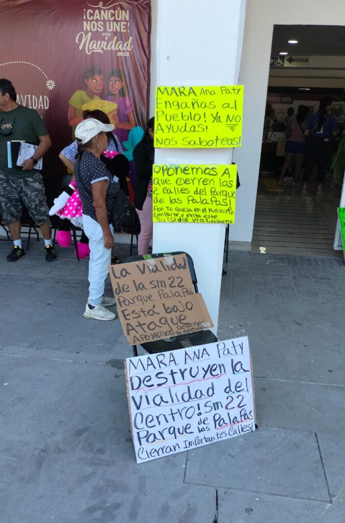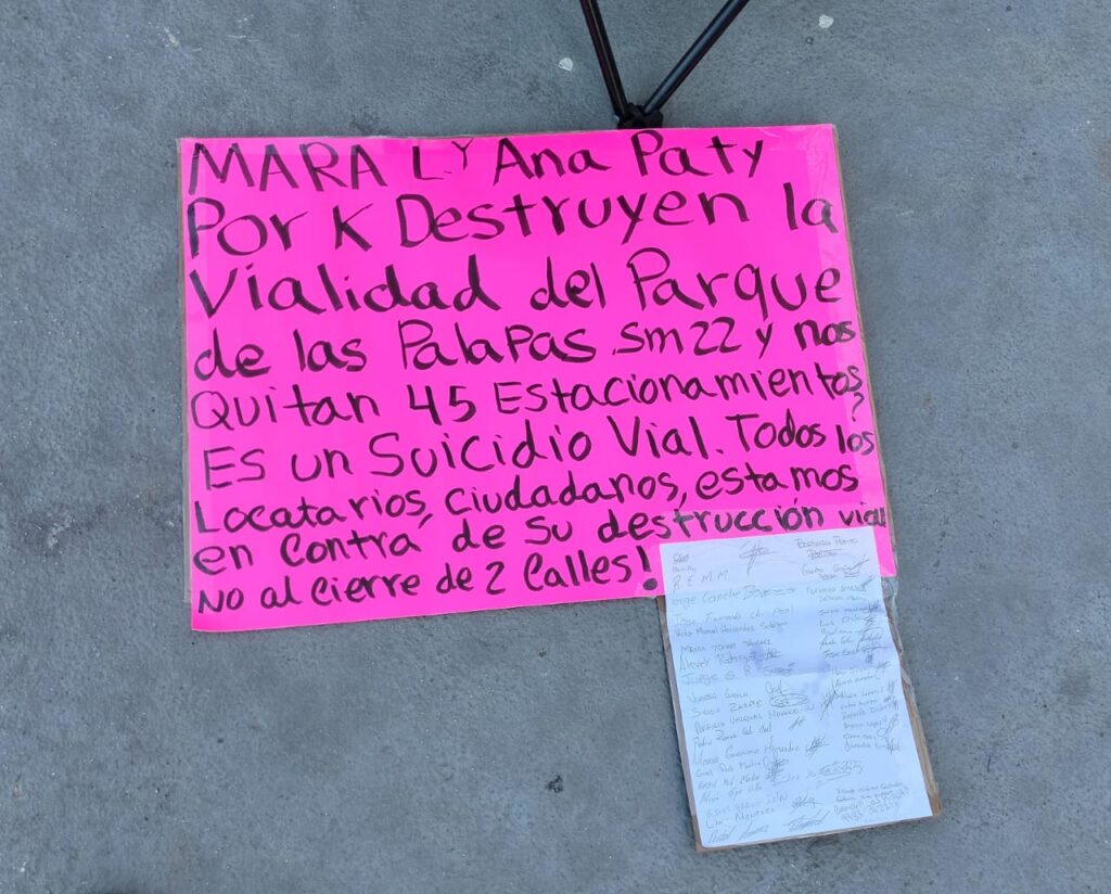 Al grito de “No al cierre de las calles”, los vecinos colocaron pancartas en la explanada y muros del Palacio Municipal donde se leía “Nos oponemos a que cierren las calles del parque de Las Palapas” y “Mara, Ana Paty, destruyen la vialidad de la SM 22”, entre otras cosas