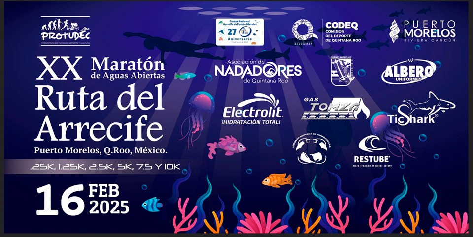 Puerto Morelos, 13 de febrero (InZoom.mx).— Puerto Morelos será nuevamente sede, este domingo, del XX Maratón de Aguas Abiertas “Ruta del Arrecife”, avalado por la Federación Mexicana de Natación y coordinado por la Asociación Nadadores Quintana Roo y Promotora de Turismo, Deporte y Cultura (Protudec), en colaboración con la Comisión del Deporte de Quintana Roo (Codeq) y el Ayuntamiento.