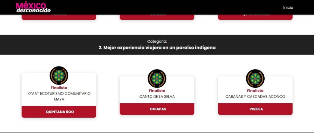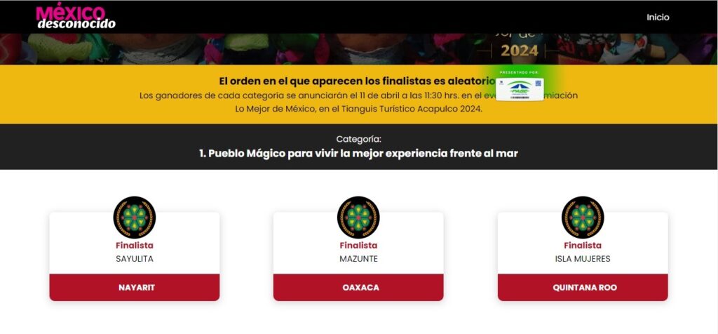 De acuerdo a la información de la dependencia federal, en Categoría “Pueblo Mágico para vivir la mejor experiencia frente al mar”, Isla Mujeres compite con Mazunte, Oaxaca y Sayulita, Nayarit; en “Mejor experiencia viajera en un paraíso indígena”, Xyaat Ecoturismo Comunitario Maya de Felipe Carrillo Puerto, es finalista con “Canto de la Selva” de Chiapas y “Cabañas y Cascadas de Aconco” de Puebla.