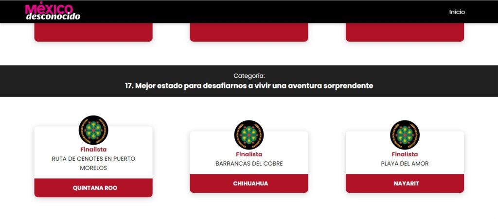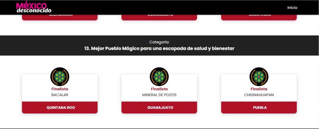 Así mismo, en la categoría “Mejor aventura para sentir la energía del agua”, el denominado Sistema Arrecifal de la Riviera Maya (SAM) que va desde Puerto Morelos hasta Tulum, compite con Nayarit (Ruta entre manglares y la tovara) y Yucatán (Cenotes de Yucatán). En “Mejor Pueblo Mágico para una escapada de salud y bienestar”, Bacalar está en riña con Mineral del Pozo, Guanajuato; y Chignahuapan, Puebla.