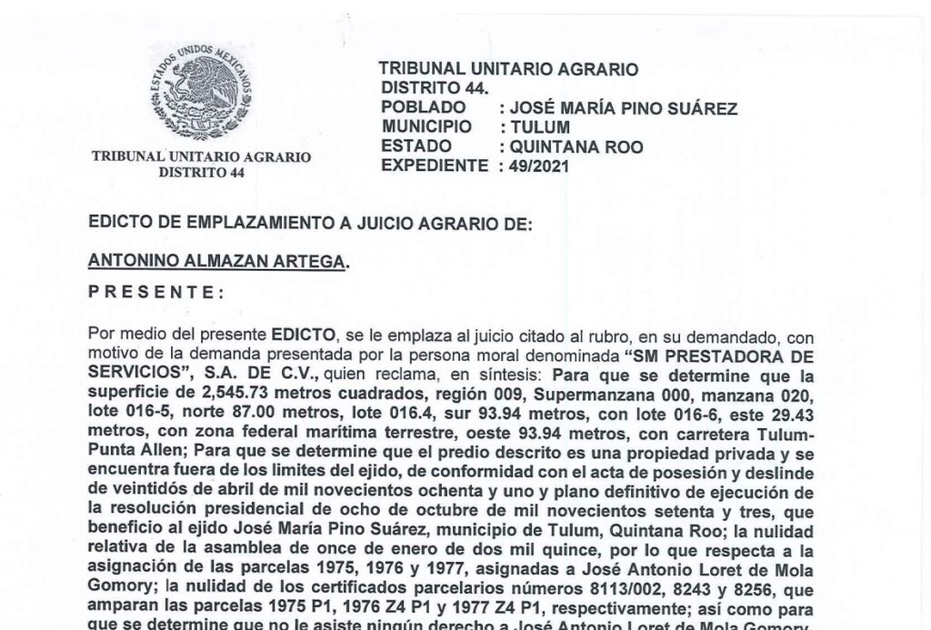 Tulum.- El Periódico Oficial del Estado publicó hoy un edicto de emplazamiento a juicio para el ejido José María Pino Suárez, perteneciente a este municipio,, promovido por la estadounidense Melissa Glee Perlman, quien reclama ser reconocida como posesionaria de una parcela.