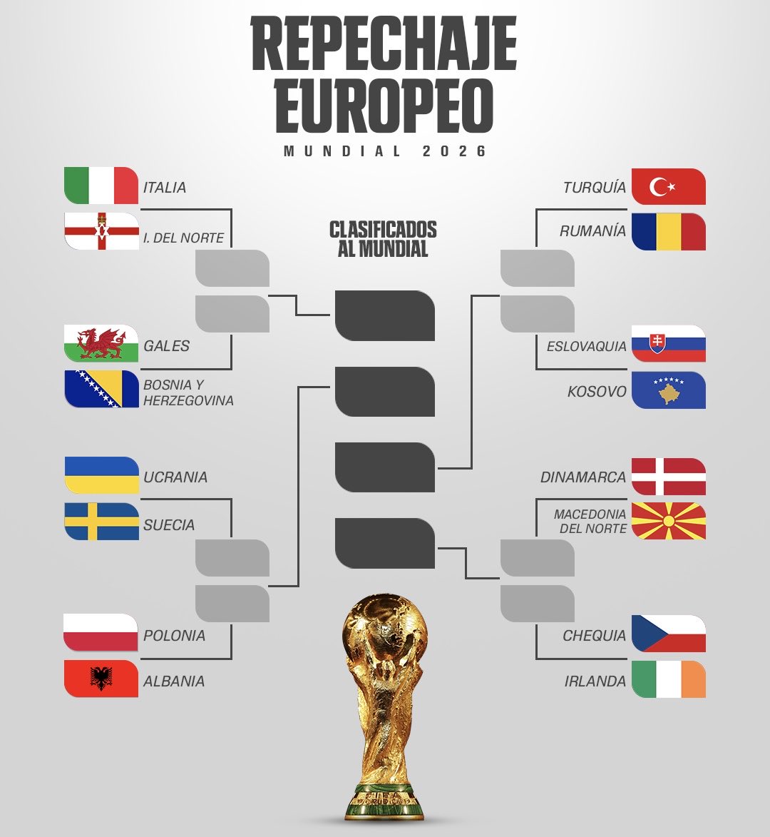 - Ruta de Italia: Si la Azzurra supera a Irlanda del Norte, deberá visitar al vencedor del cruce entre Gales y Bosnia. Esta será la tercera repesca consecutiva para Italia, que busca volver al Mundial tras su última participación en Brasil 2014.