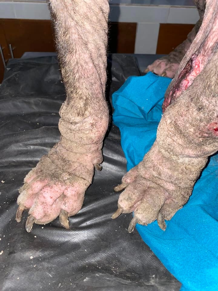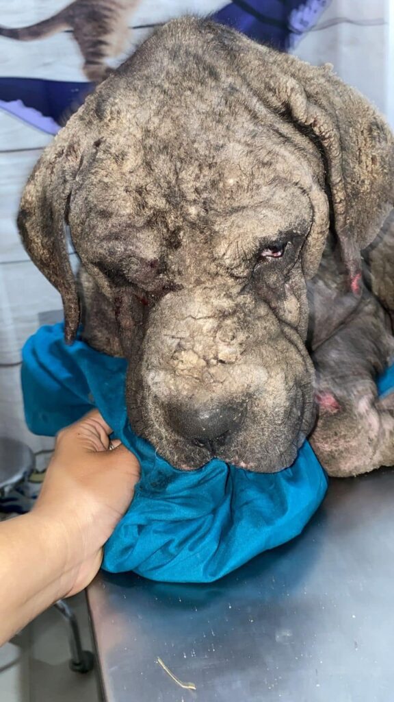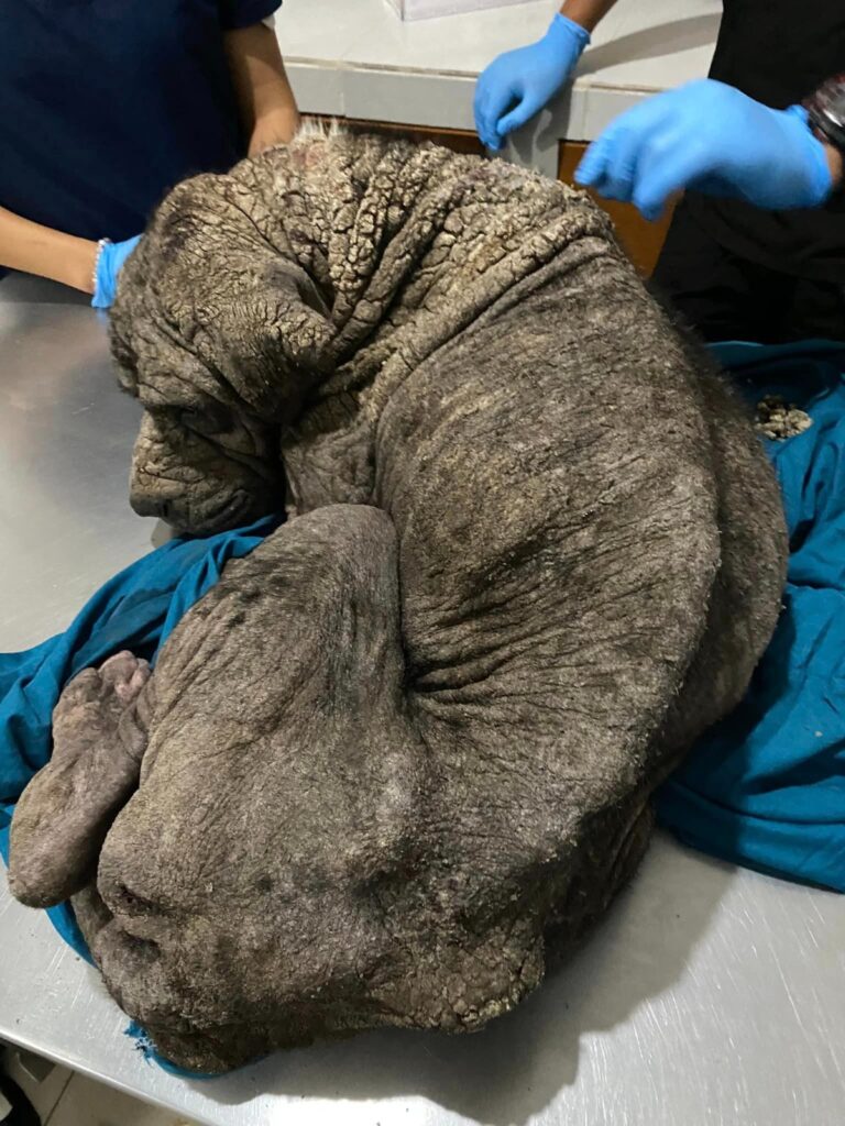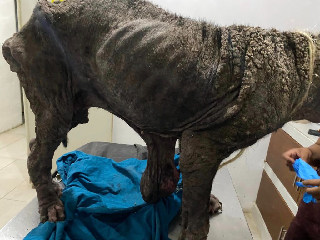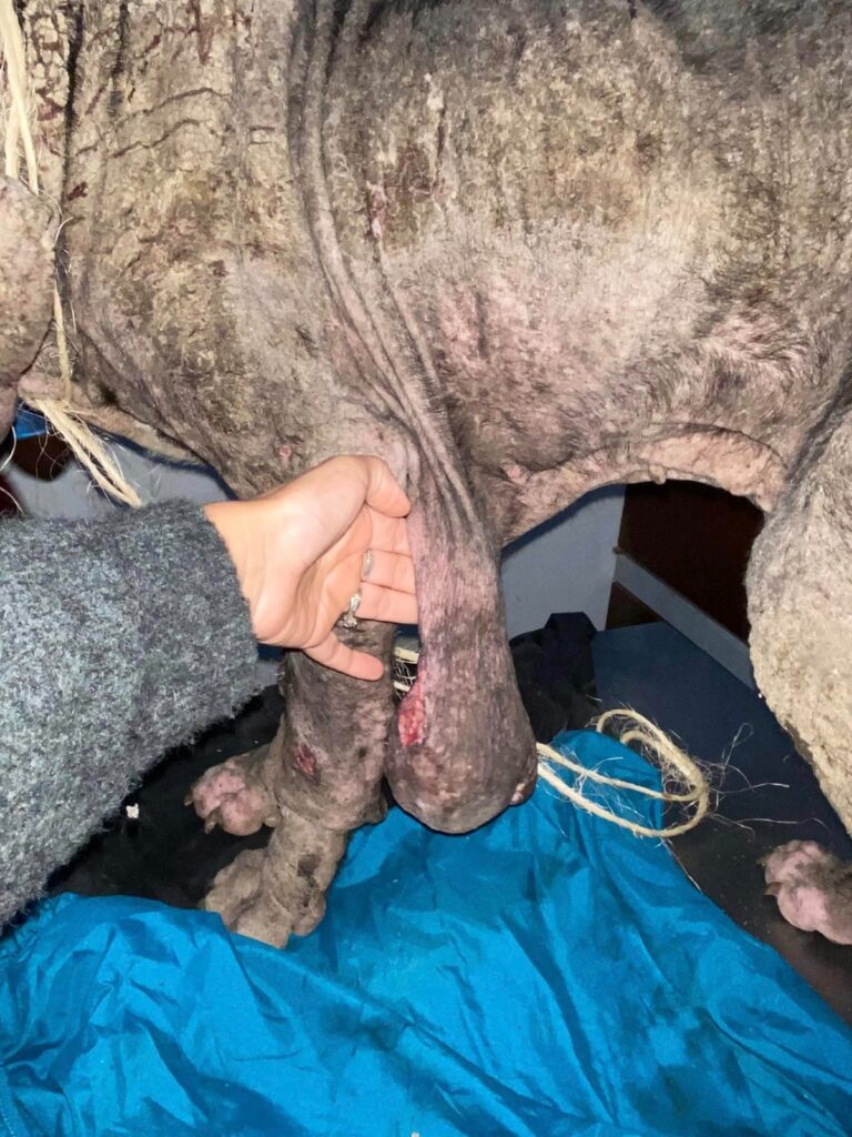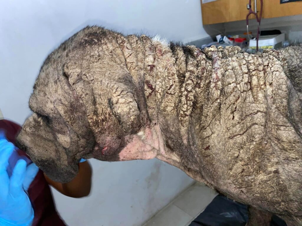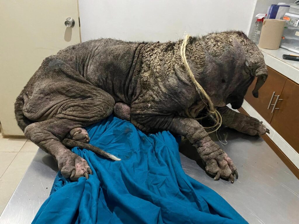 “Ónix” luce en deplorable estado, con bajo peso, alopecia y abundantes úlceras en distintas partes del cuerpo. El tumor, del tamaño de un puño, le cuelga del pecho hasta casi rozar el piso.