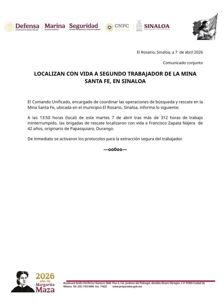 El Rosario, Sinaloa. Tras una extenuante jornada de 312 horas de labor ininterrumpida, las brigadas de salvamento lograron localizar con vida a Francisco Nájera, uno de los operarios que permanecía bajo tierra tras el colapso en la mina Santa Fe. El hallazgo se registró la tarde de este martes en el yacimiento ubicado en la comunidad de Chele, perteneciente al municipio de El Rosario, Sinaloa. El Comando Unificado confirmó que el trabajador, de 42 años y originario de Durango, fue hallado en una zona profunda del complejo, activando de inmediato los protocolos de extracción segura para trasladarlo a la superficie de la entidad.