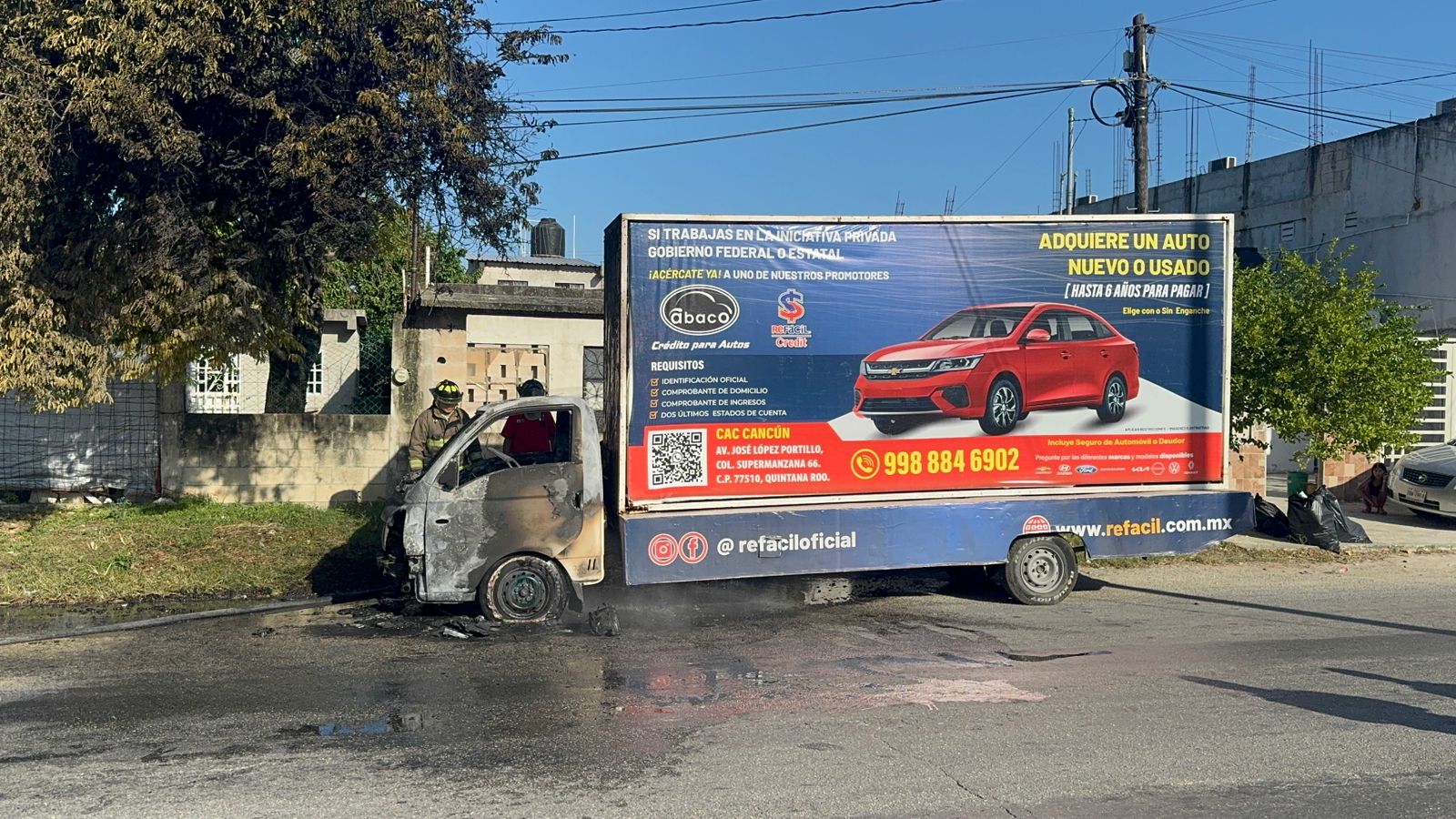 Cancún.- Esta mañana, una camioneta con publicidad móvil se incendió sobre la avenida “Leona Vicario” con calle 107, en la Región 220 de esta ciudad, por lo que el H. Cuerpo de Bomberos fue movilizado; hasta el momento no se reportan lesionados.