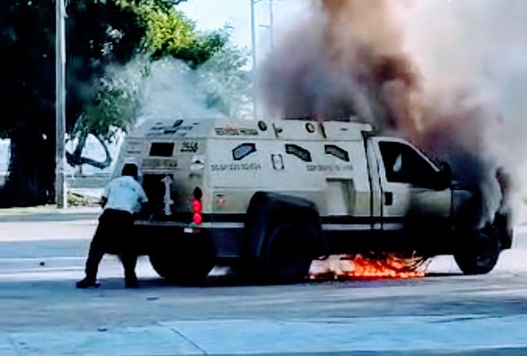 Chetumal.- Una camioneta de valores de la empresa Cometra se incendió esta tarde en en la avenida Héroes y la calle 22 de enero, frente al Palacio de Gobierno.