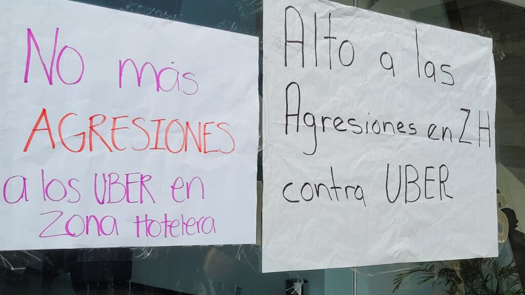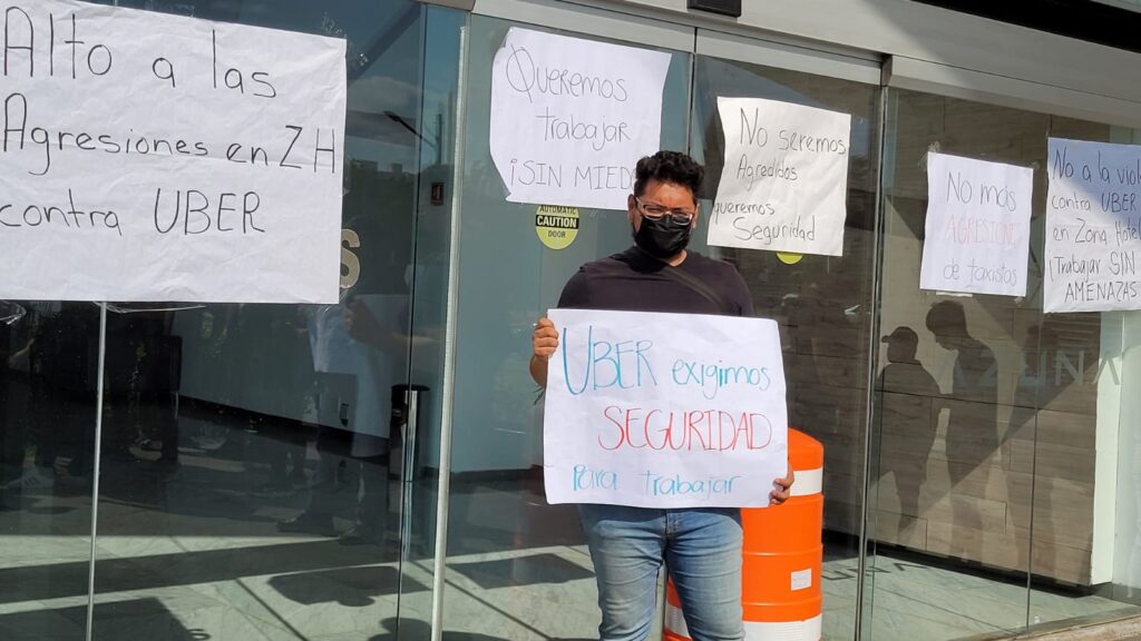Cancún.- Alrededor de 50 operadores de Uber se manifiestan frente a las oficinas de esta plataforma en Cancún, para exigir la intervención de esta empresa frente a los ataques que reciben por parte de los taxistas del Sindicato “Andrés Quintana Roo”.