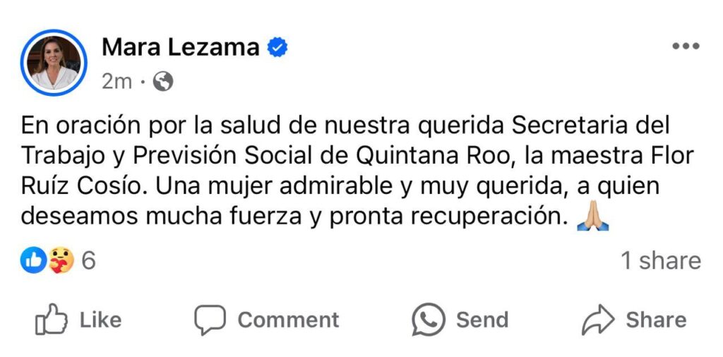 La gobernadora Mara Lezama expresó solidaridad con Ruiz Cosío mediante redes sociales, deseándole una pronta recuperación. Desde este medio también hacemos llegar nuestros votos por su restablecimiento.