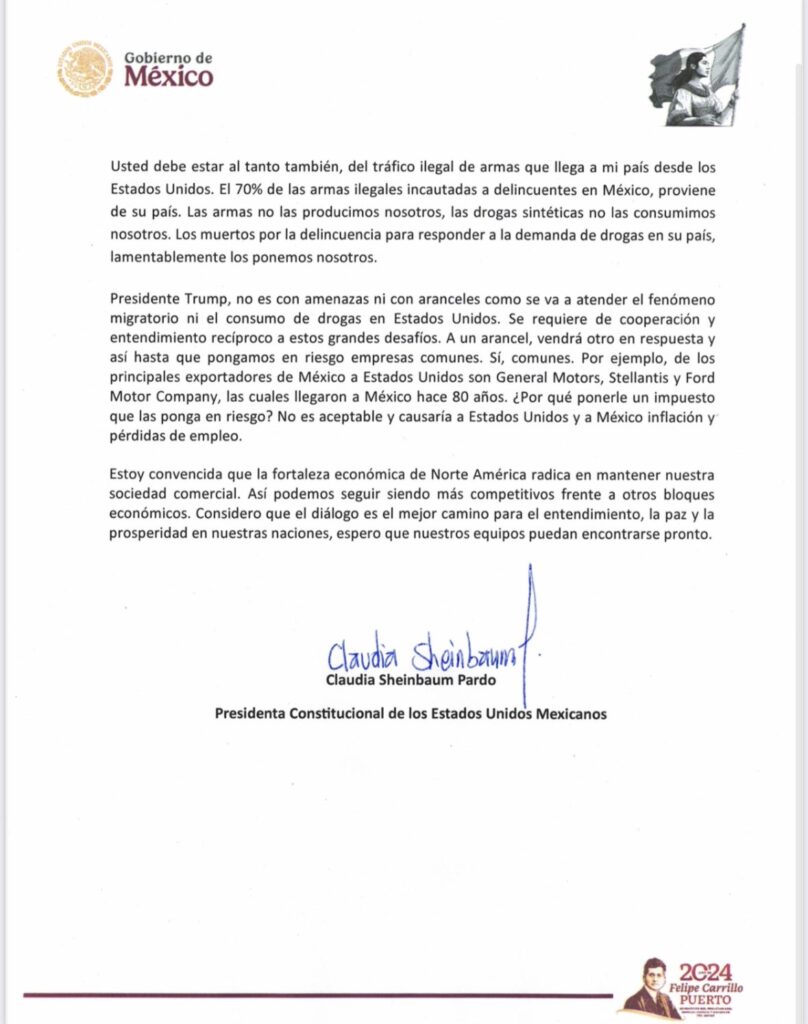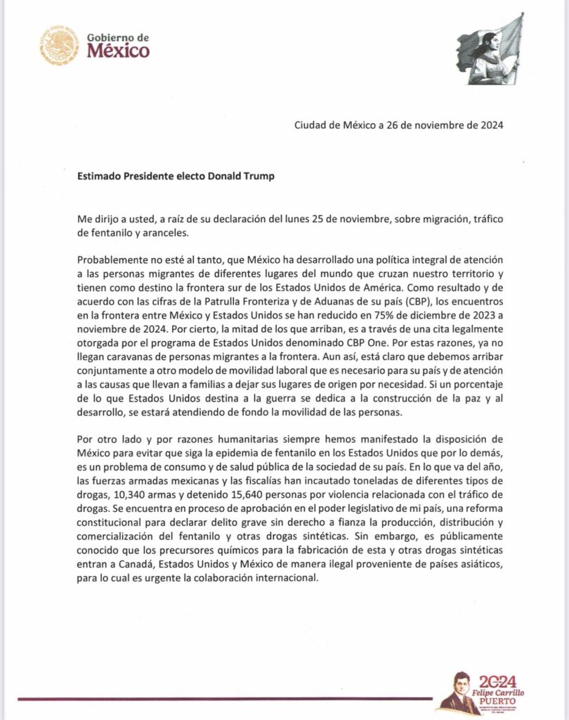 La carta de Sheinbaum se produce en un contexto tenso, luego de que Trump anunciara su intención de firmar una orden ejecutiva que implementaría aranceles significativos al asumir la presidencia el 20 de enero. Trump argumentó que estas tarifas se mantendrán hasta que México y Canadá tomen medidas drásticas contra la migración ilegal y el tráfico de drogas, un enfoque que ha sido criticado por varios economistas y legisladores mexicanos.
