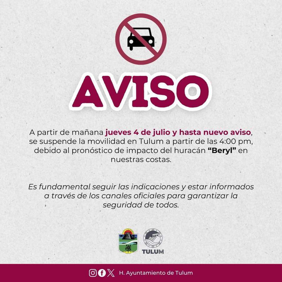 Felipe Carrillo Puerto.-La gobernadora Mara Lezama Espinosa anunció la mañana de este jueves la suspensión de la movilidad vehicular, a partir de las 4 de la tarde, en Tulum, Felipe Carrillo Puerto y José María Morelos, por llegada del huracán “Beryl”.