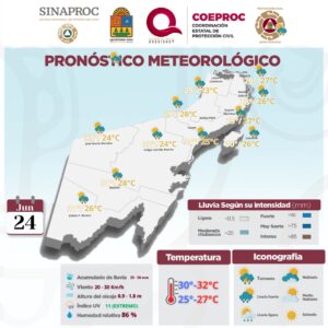 Además, se prevén vientos con rachas de hasta 70 km/h y la posible formación de trombas marinas en las costas de Tamaulipas, Oaxaca, Chiapas, Yucatán y Quintana Roo.