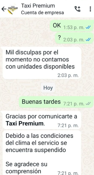 Por su parte, algunas plataformas digitales de servicio especial de taxi, como Radio Taxi y Taxi Premium, optaron por suspender sus operaciones durante la tormenta, alegando que no contaban con unidades disponibles debido a las condiciones climáticas.