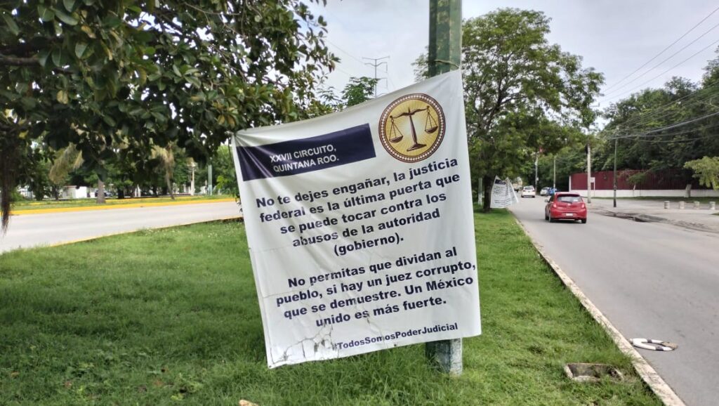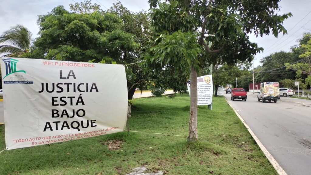 Cancún.- Trabajadores del Poder Judicial de la Federación retomaron su protesta pacífica en contra de la reforma judicial, afuera de los tribunales de la avenida Andrés Quintana Roo de esta ciudad.