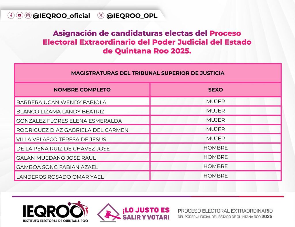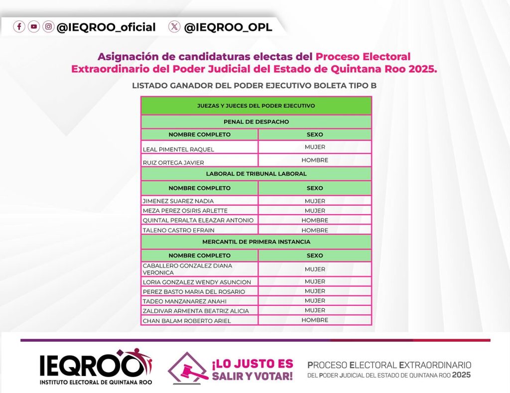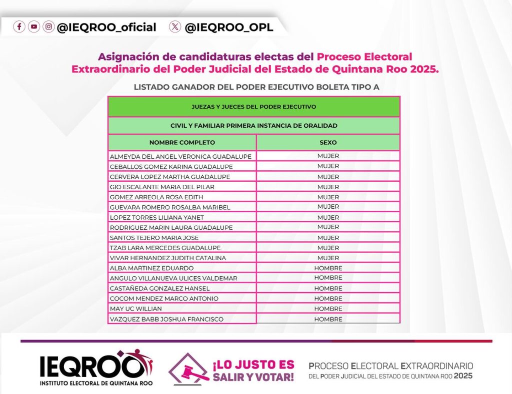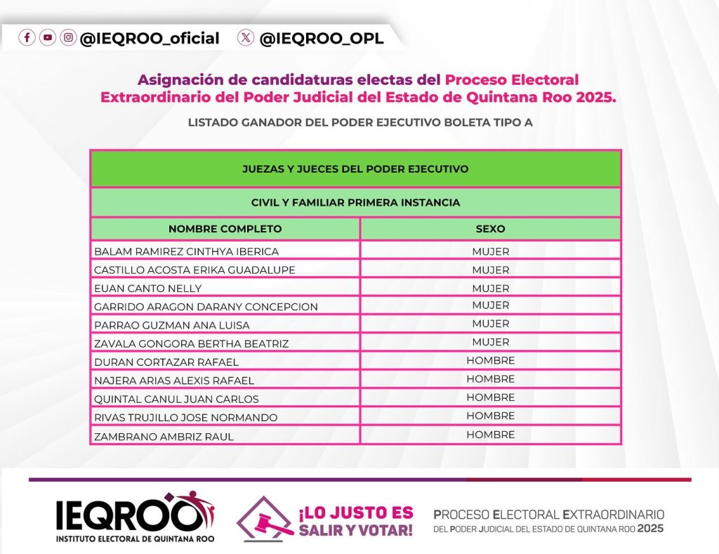 El Instituto Electoral de Quintana Roo (IEQROO) ha validado y asignado los cargos de las elecciones para el Proceso Electoral Extraordinario del Poder Judicial del Estado de Quintana Roo (PEEPJ) 2025. En total, se asignaron 117 cargos, de los cuales 62 fueron para mujeres y 55 para hombres, cumpliendo así con el principio de paridad de género.